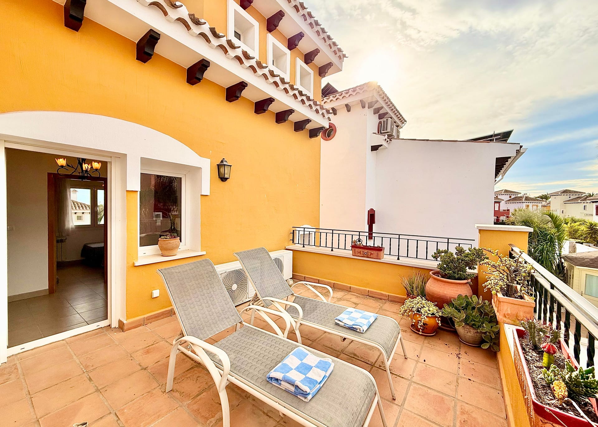 Upstairs, the villa offers two generous double bedrooms, each fitted with full-height wardrobes and air conditioning for year-round comfort. A well-sized family bathroom sits between the bedrooms, and from the landing you can access an additional west-facing upper terrace, providing another private outdoor space to enjoy.