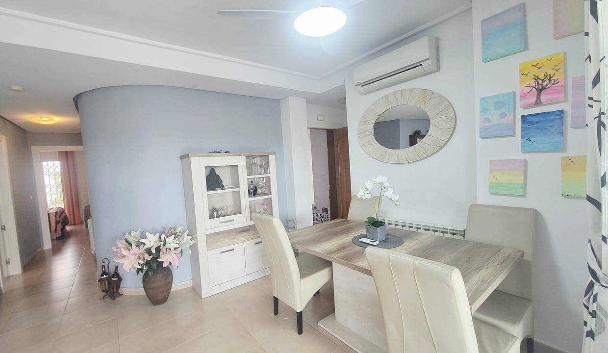 This apartment is the most sought-after design, with its signature curved wall and larger kitchen space. It has been tastefully upgraded, including a modern bathroom with a large walk-in shower and new tiling throughout. The extended terrace has been stylishly tiled and now features glass curtains. Allowing the covered area to be using as a dining room. The generously sizes kitchen is fully equipping and boasts upgraded marble countertops. Both double bedrooms have patio doors that open directly to the terrace, ensuring sunlight throughout the day. Enjoy golf views and be just a short stroll from all the amenities La Torre Golf Resort has to offer. The apartment is being sold fully furnishes, with private underground parking, ready for you to move in and live the Spanish dream.