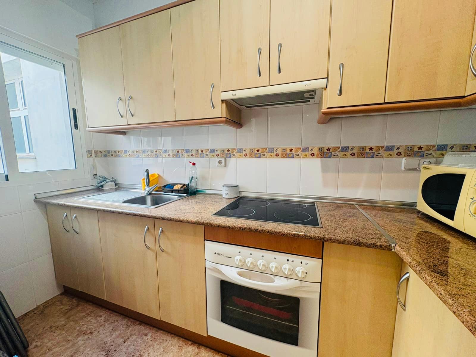 The apartment features a fully equipped kitchen, a practical separate laundry room, and a bright, sunny terrace ideal for relaxing or dining outdoors. Residents also benefit from a communal solarium with sea views, providing the perfect space to enjoy the Mediterranean sunshine.