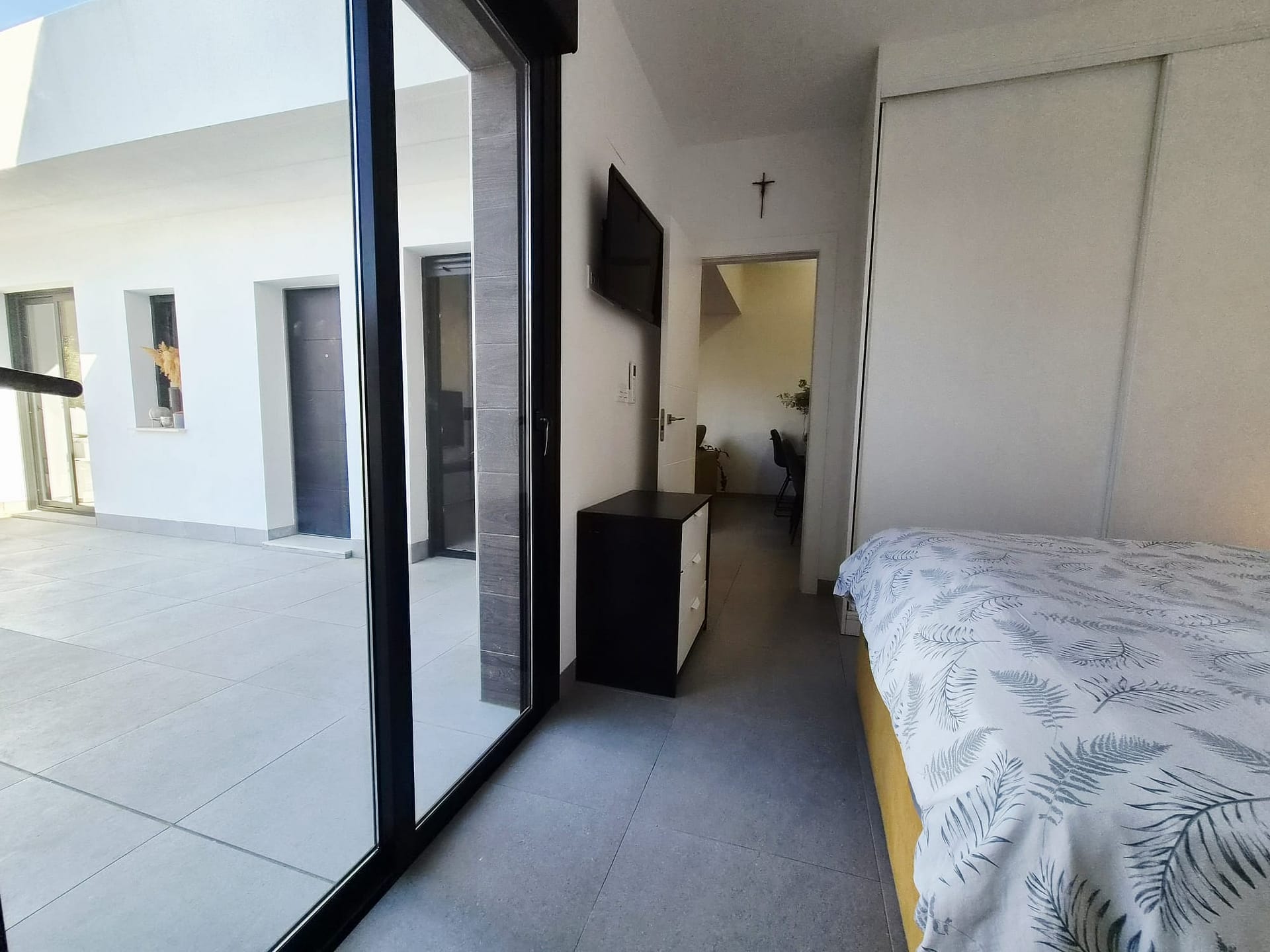 The villa has two spacious double bedrooms. Each bedroom includes a modern en-suite bathroom. Furthermore, both bedrooms have direct access to the terrace. Because of this, the rooms feel bright and sunny throughout the day.