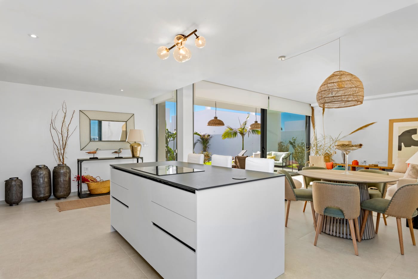 The exteriors of these independent homes in Mar de Cristal are designed to maximize enjoyment of the Mediterranean climate. Each property features a private pool, perfect for cooling off during warm summer days. The terraces offer additional space for outdoor relaxation, whether sunbathing or enjoying an al fresco dinner. The solarium is another attraction, providing an ideal place to take in the views and enjoy moments of tranquility. The presence of a private garage ensures convenience and security for vehicle parking.