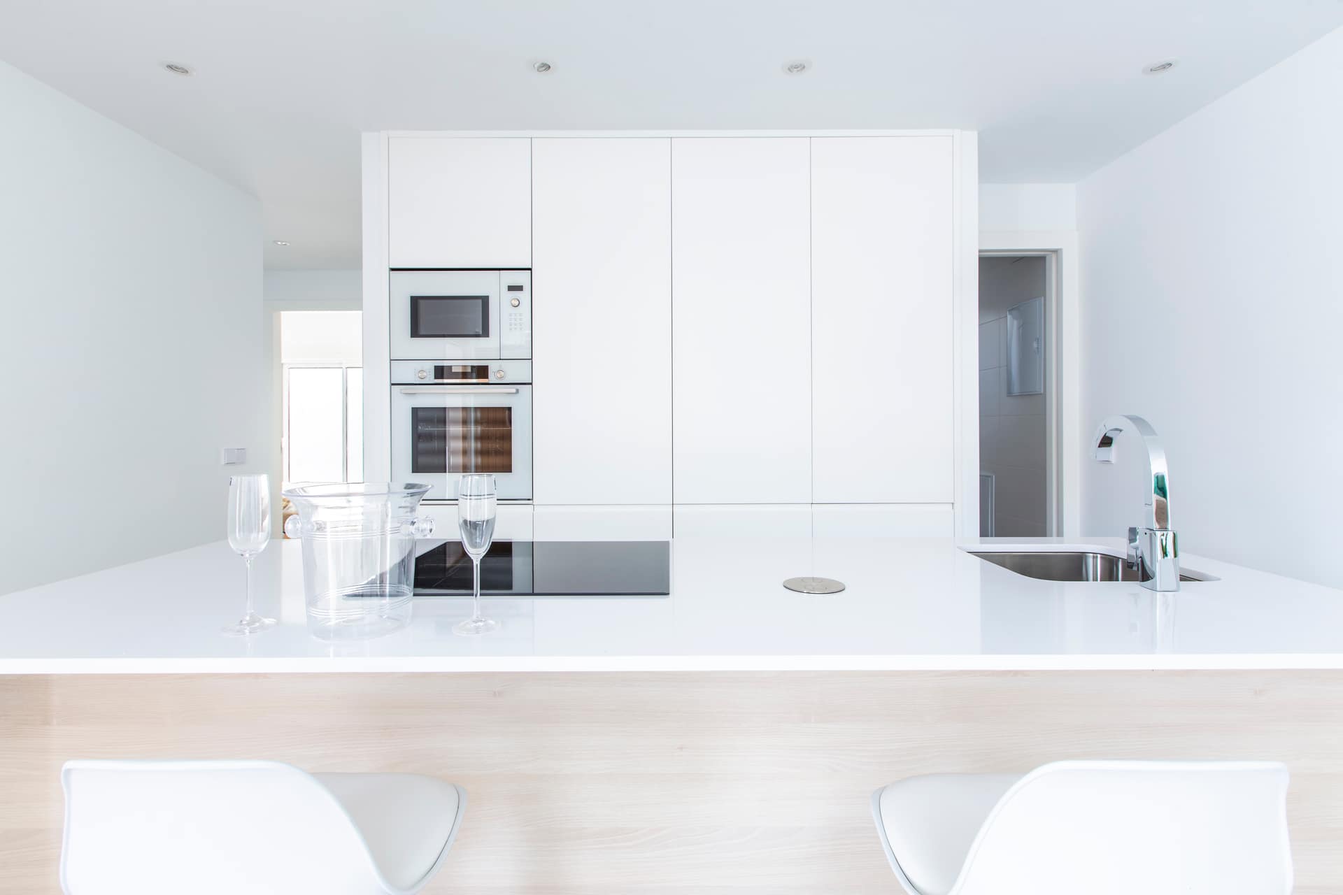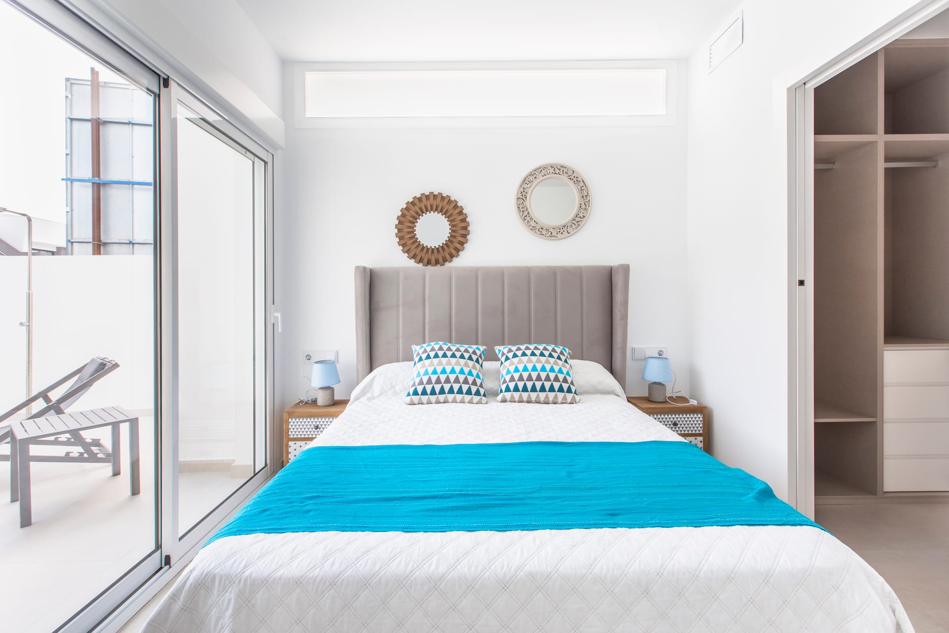 The interior of the villas is designed to maximise comfort and functionality. The ground floor features a bright living room with open plan kitchen, equipped with modern appliances and high quality materials. The living room has direct access to the terrace and swimming pool, creating an open and airy space ideal for everyday living. On this floor there is also a double bedroom with fitted wardrobe and a complete bathroom. The first floor houses two spacious bedrooms, one with built-in wardrobe and the other with dressing room and en-suite bathroom, offering a private and comfortable space. The high quality finishes and detailed design ensure a luxurious and modern living experience. With a living area of 105 m², the interiors are designed to offer a cosy and functional environment.