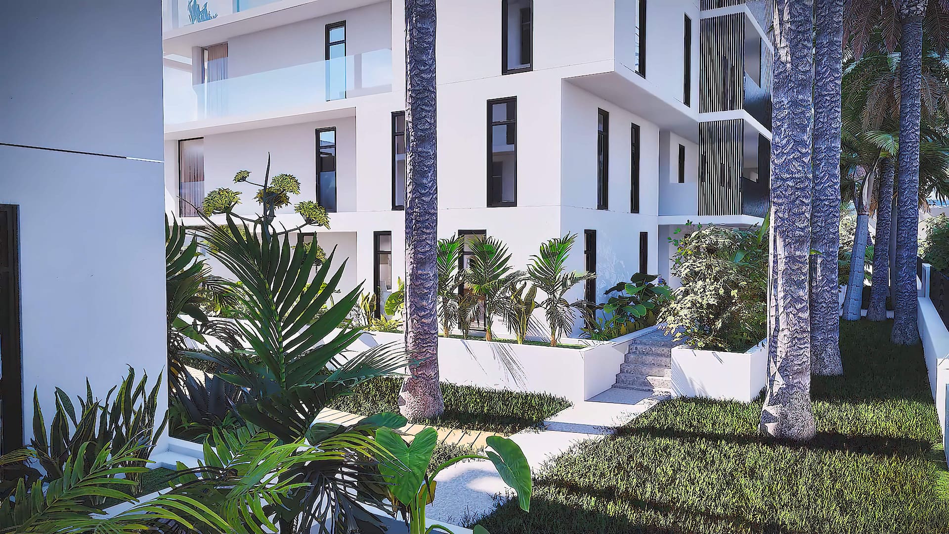 The exteriors of these homes are designed to maximize enjoyment of the Mediterranean climate. Each property features a private terrace, perfect for outdoor relaxation or al fresco dining. The ground floors have private gardens, offering additional space for leisure or gardening. Additionally, the penthouses include a solarium, providing an exclusive place for sunbathing with total privacy. Proximity to the sea, just 400 meters away, allows for coastal walks and water activities.