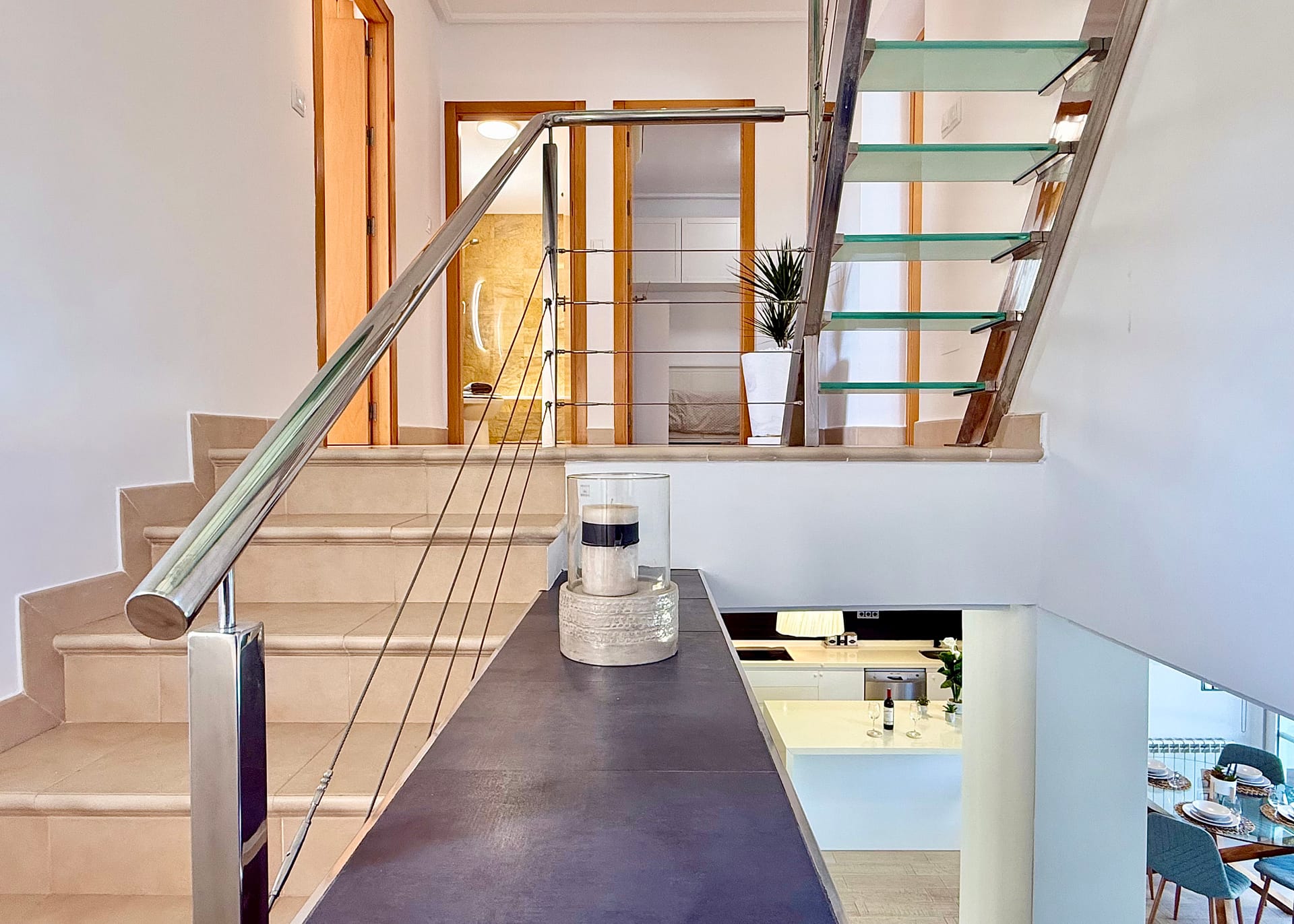 A contemporary glass staircase leads to the tower level, currently used for additional storage. This architectural feature adds character and offers further potential for creative use.