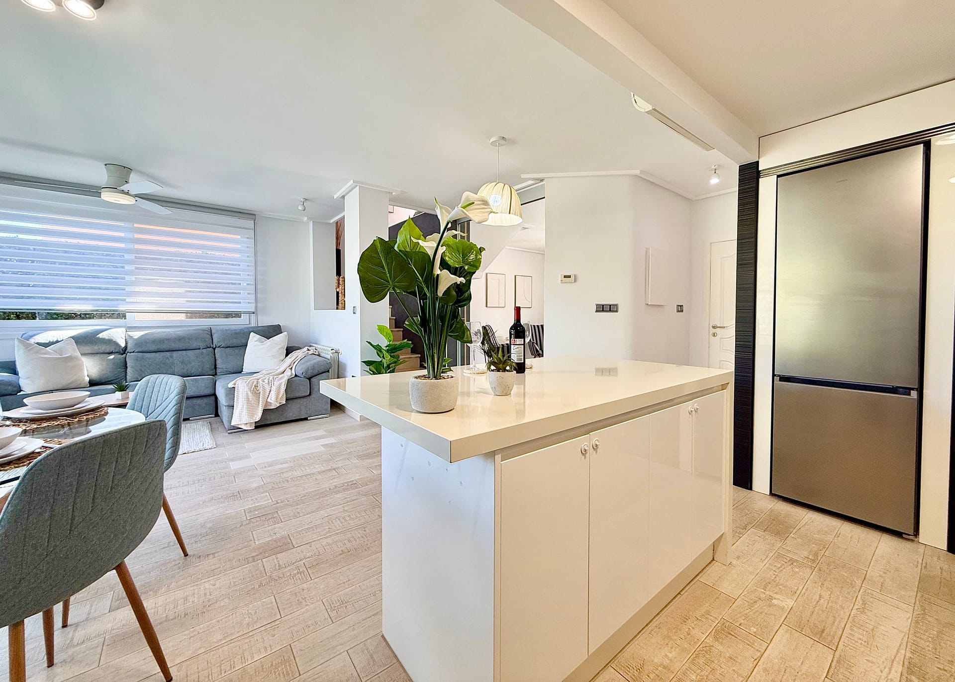 At the heart of the home is the upgraded contemporary kitchen, complete with a substantial central island. This feature acts as both a practical workspace and a stylish social hub — perfect for entertaining, relaxed family living or enjoying drinks with friends.