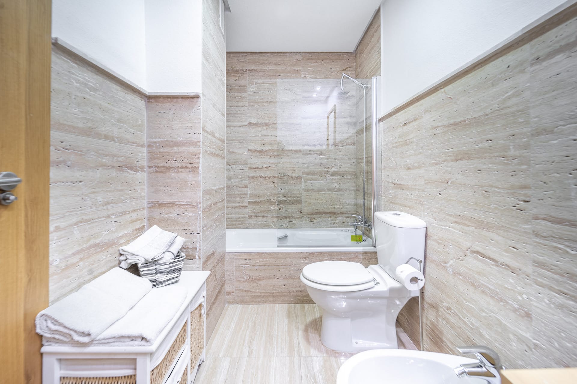 The bedroom is generously sized, featuring a built-in wardrobe for easy organization, creating a relaxing and restful environment. The bathroom is modern and functional, complete with a shower, sink, and WC, finished to a high standard. Neutral décor throughout the apartment ensures a fresh and timeless aesthetic, complemented by quality finishes that make the space both practical and inviting.