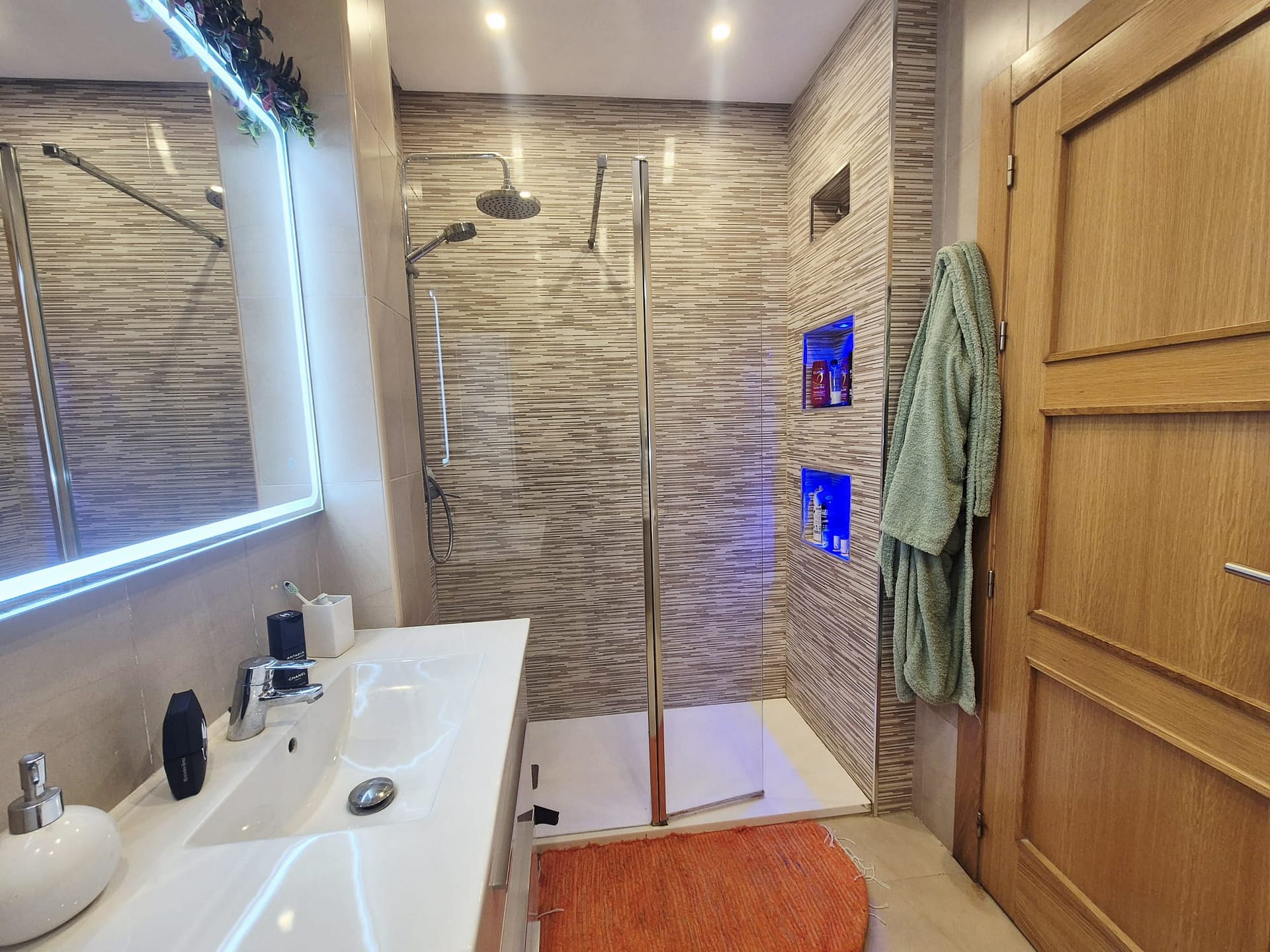 The main bathroom has been completely upgraded with a luxurious walk-in shower, modern fixtures, and stylish finishes, offering a spa-like experience.