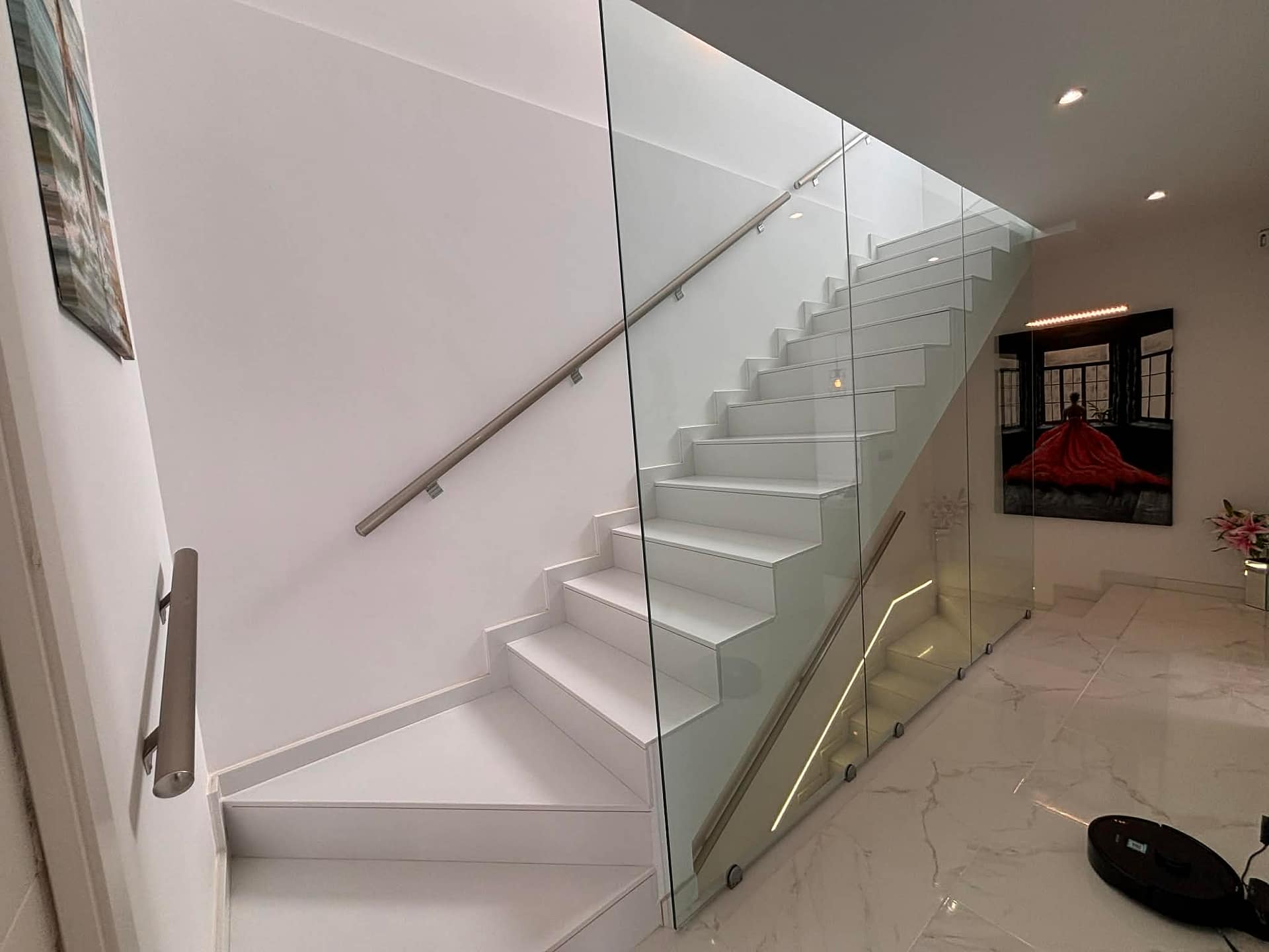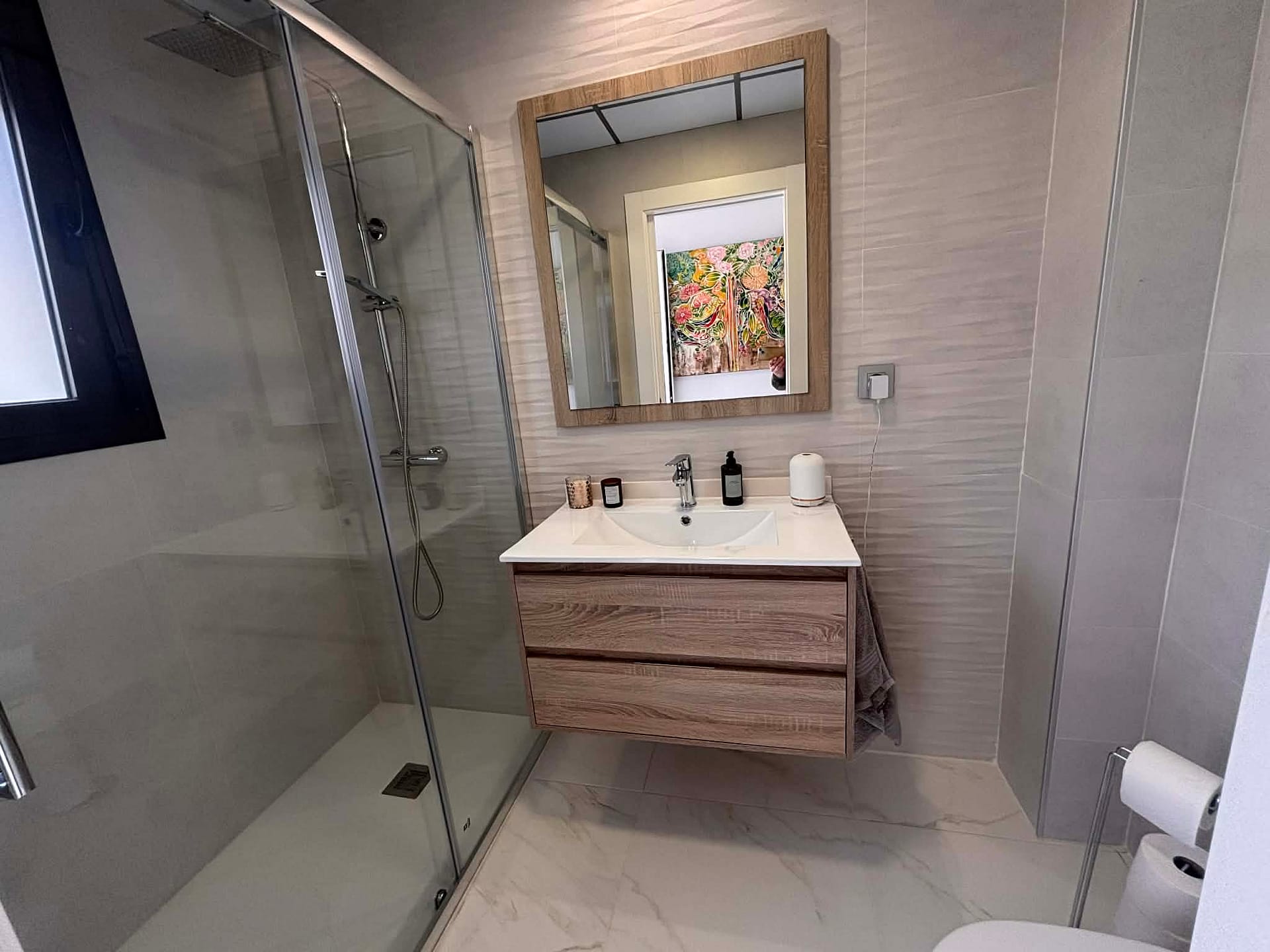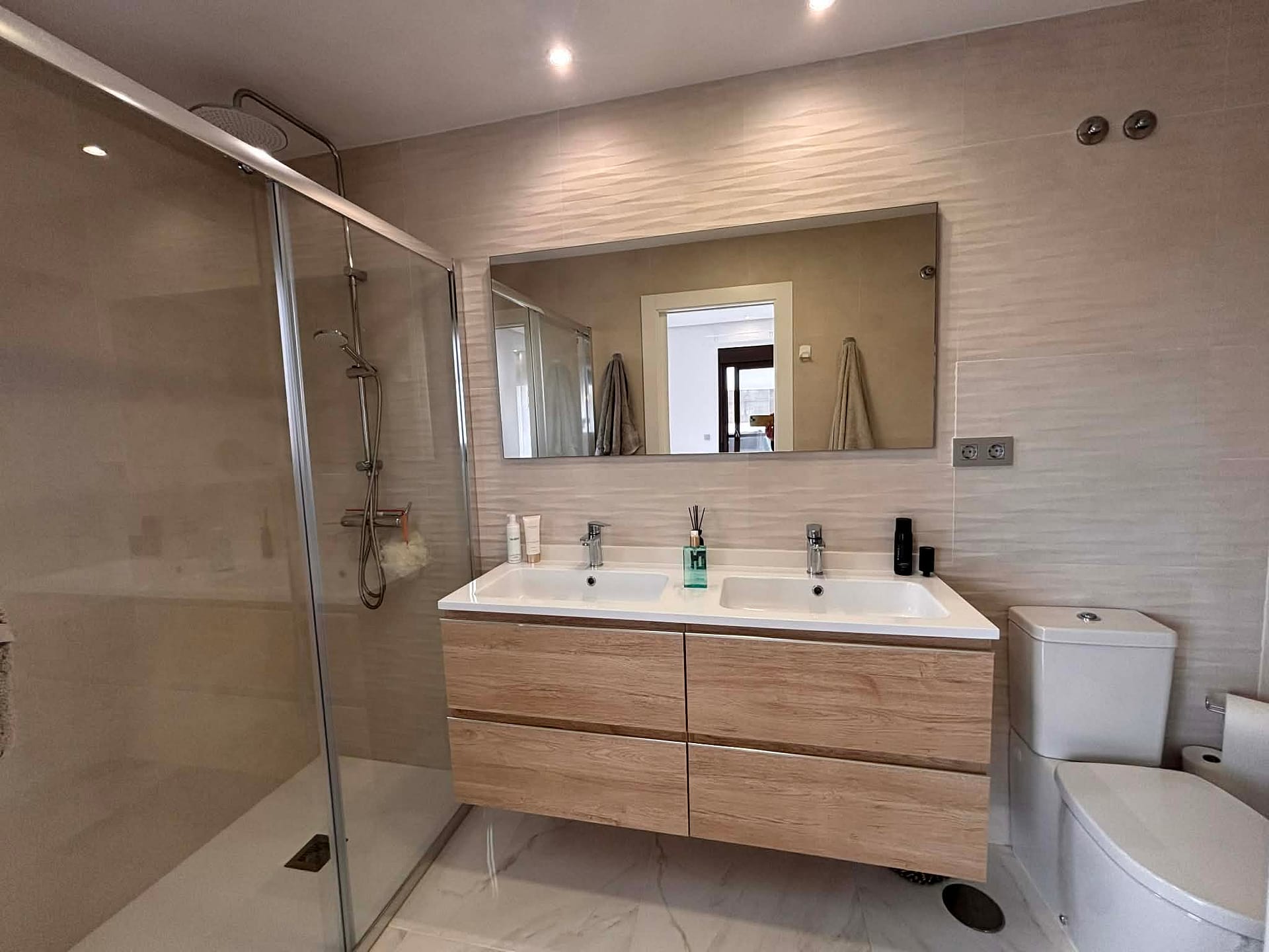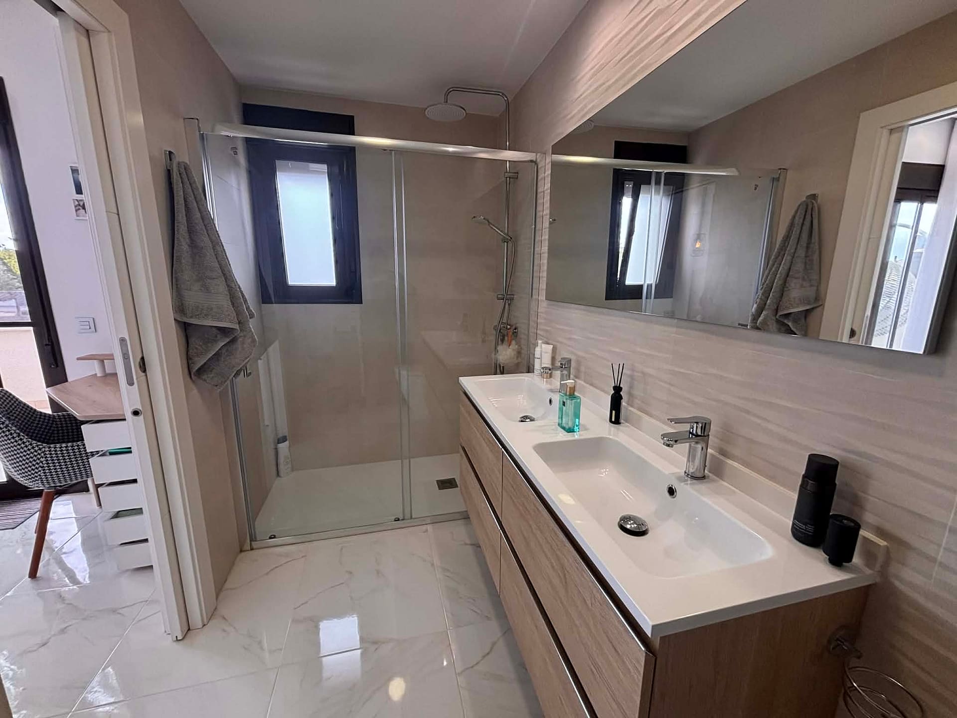 The townhouse features three generous double bedrooms, all with fitted wardrobes. Furthermore, there are three modern family bathrooms, each finished to a high standard with contemporary walk-in showers. The master bedroom stands out, as it includes a walk-in wardrobe and direct access to a private sunny terrace.