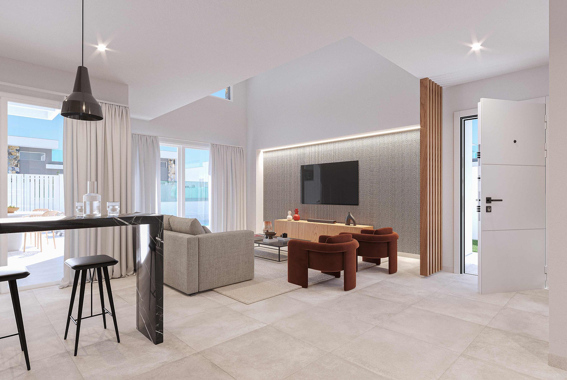 Inside, the villas offer bright, modern interiors finished to a high standard. Large aluminium windows allow natural light to fill the living spaces, while built-in wardrobes provide practical storage.