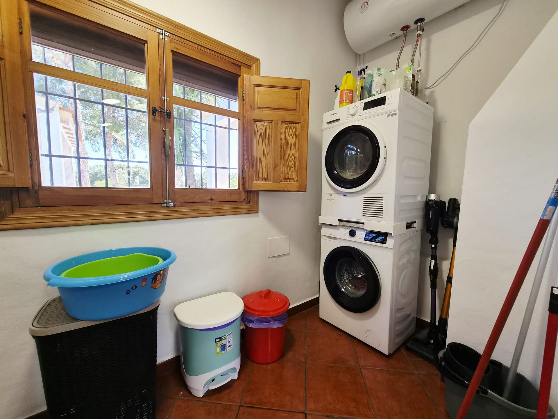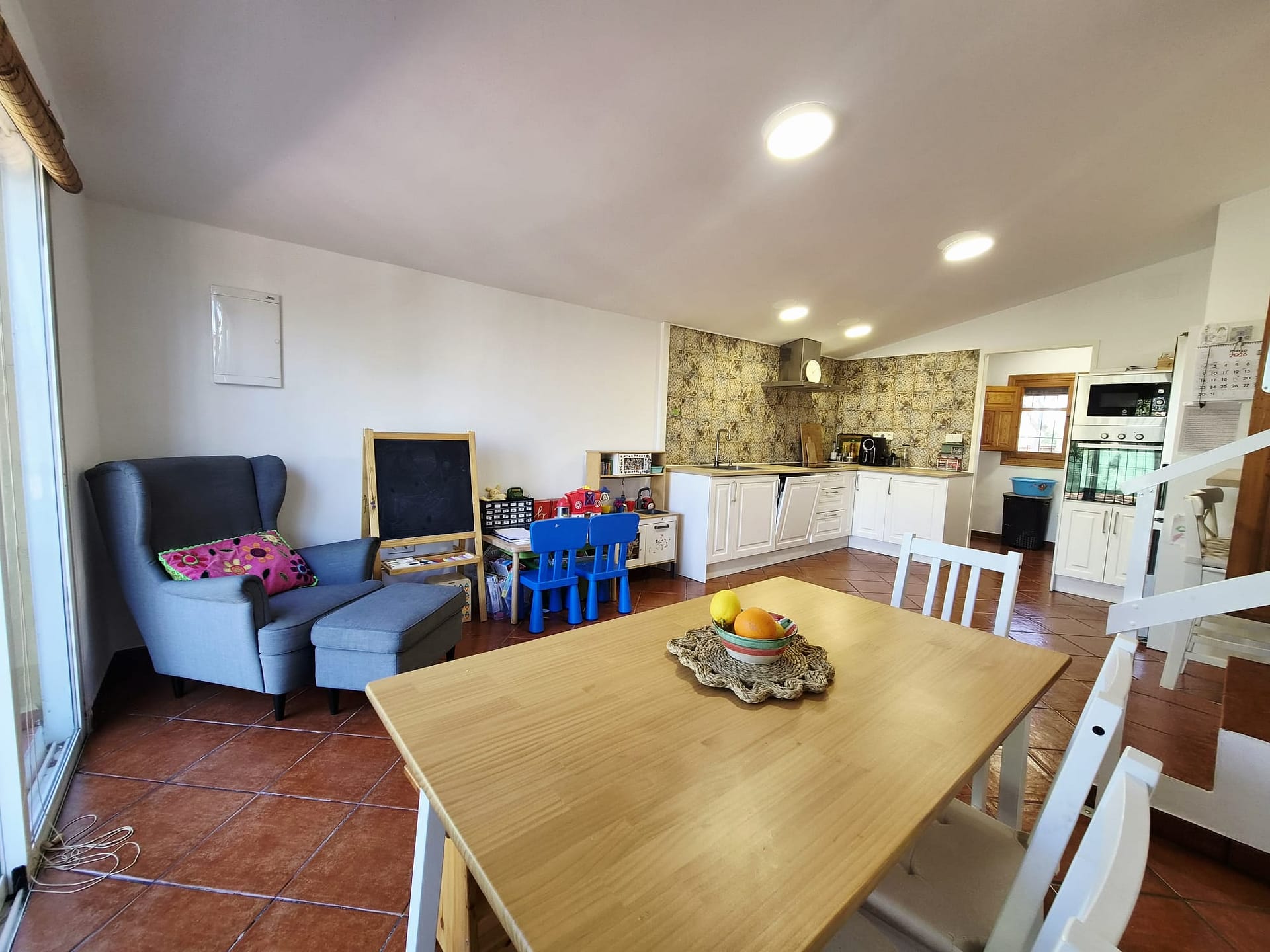 The property features 4 spacious bedrooms and a family bathroom, along with a large fully equipped kitchen, ideal for everyday living and entertaining. Throughout the home, you’ll find air conditioning and exposed polished wooden beams, adding warmth and authentic Mediterranean charm.